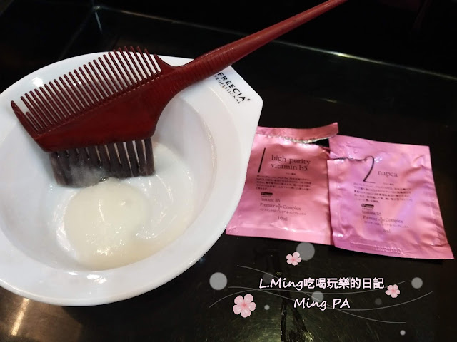 把高純度維生素B5和NAPCA混合,塗抹於髮根上,靜待10分鐘;由於我的頭髮都比較長,髮型師都很有耐性。